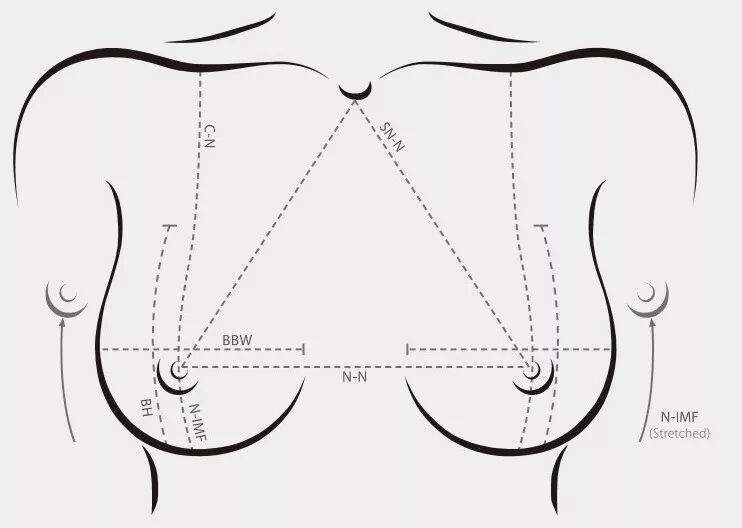 假体大小的选择与受术者的乳房条件相关。在手术前,医生要对求美者进行精密的乳房数据测量,包括:乳房基底宽度(BW),皮肤向前最大拉伸值(APSS),乳头到乳房下皱襞距离(N:IMF)以及乳腺充盈度(PCSEF)等。这些测量数据决定了受术者能够安全放入的假体大小范围,在这个安全范围内,受术者可以根据自己的喜好来选择一个更满意的假体大小。