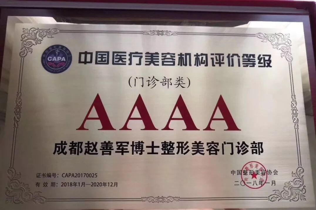 此次中国整形美容协会颁发给赵博士整形美容的“中国医疗美容机构AAAA”证书,是对赵博士11年来用心服务客户,坚持安全整形工作及在推动中国整形美容事业,特别是西南地区整形美容事业中所做出的努力的肯定,更要求着赵博士在未来的整形工作中不断地提高整形医疗质量,树立中国整形行业标杆,更好地为有整形需求的客户服务。